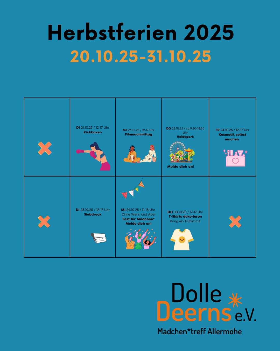 unser Herbstferienprogramm ist online und wir freuen uns schon darauf mit euch ganz viel Spaß zu haben 🙂 Für die Ausflüge benötigt ihr eine Anmeldung, kommt im Mädchen*treff vorbei und holt sie euch raus! Wir können keine keine Plätze über Mails oder Anrufe reservieren.